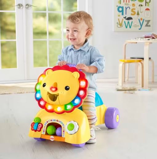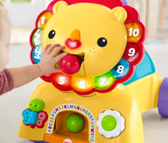 - Diseñado para estimular las habilidades motoras gruesas y finas del bebé mientras empuja, se monta, presiona botones y alimenta al león. Ideal para acompañar su crecimiento.