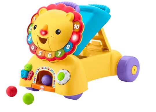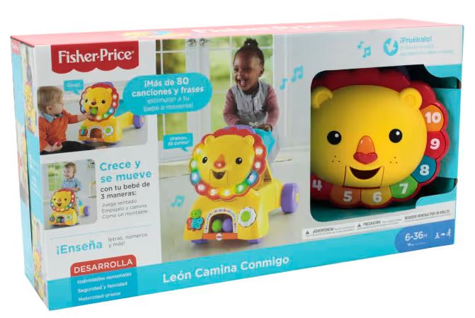 Con 3 formas de jugar que crecen con tu bebé, el León Camina Conmigo de Fisher-Price® es triplemente divertido ¡y muy versátil! Cada estación lleva a los pequeños a lograr metas importantes en su desarrollo. Sentarse y jugar. Para los bebés que aún no caminan, un montón de actividades prácticas convierten a este león en un divertido juguete. Tiene una nariz de botones luminosos… una melena con 10 botones luminosos que enseñan los números y los colores… una aleta de mariposa… un divertido spinner… ¡y pelotas para “darle de comer” al león que después le salen por debajo! Empujar y caminar. Cuando tu pequeño esté listo para levantarse y andar, levanta el asiento para que le sirva de asa para dar sus primeros pasos, mientras divertidas frases y canciones le animan a seguir adelante. “¡Uno, dos, tres pasos hay que dar!” Deslizar y montar. Sacar a pasear a este tierno amigo león es muy fácil. Solo tienes que bajar el asiento para que tu pequeño se deslice al ritmo de frases y canciones divertidas. “¡Vamos a movernos!”