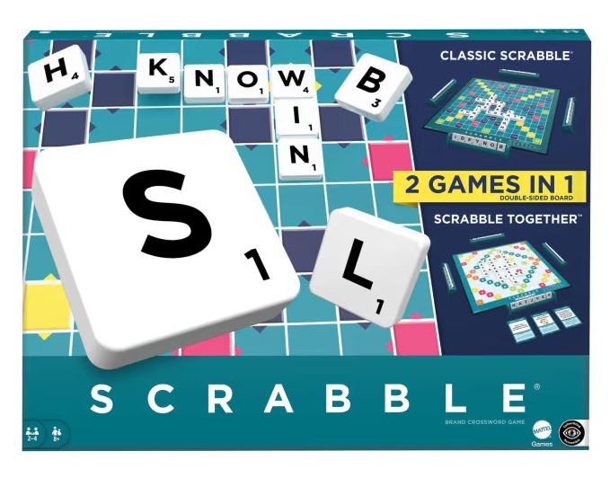 - DOS EN UNO. ¡Experimenta la emoción de los juegos de mesa con Scrabble® 2 en 1! Una experiencia única que mantendrá tu mente en movimiento y tus palabras fluyendo. Incluye un tablero de juego de doble cara, 100 fichas de letras y 56 cartas