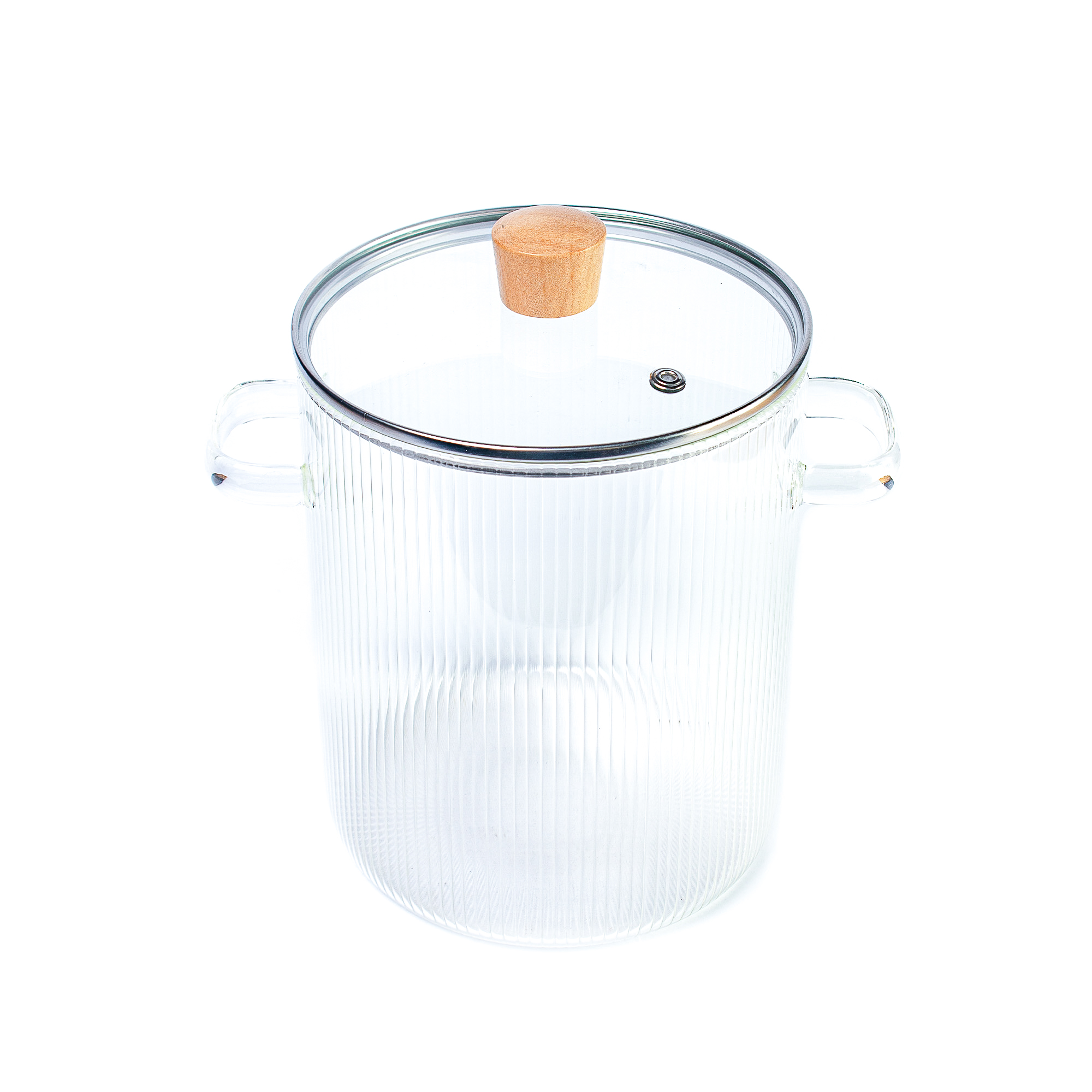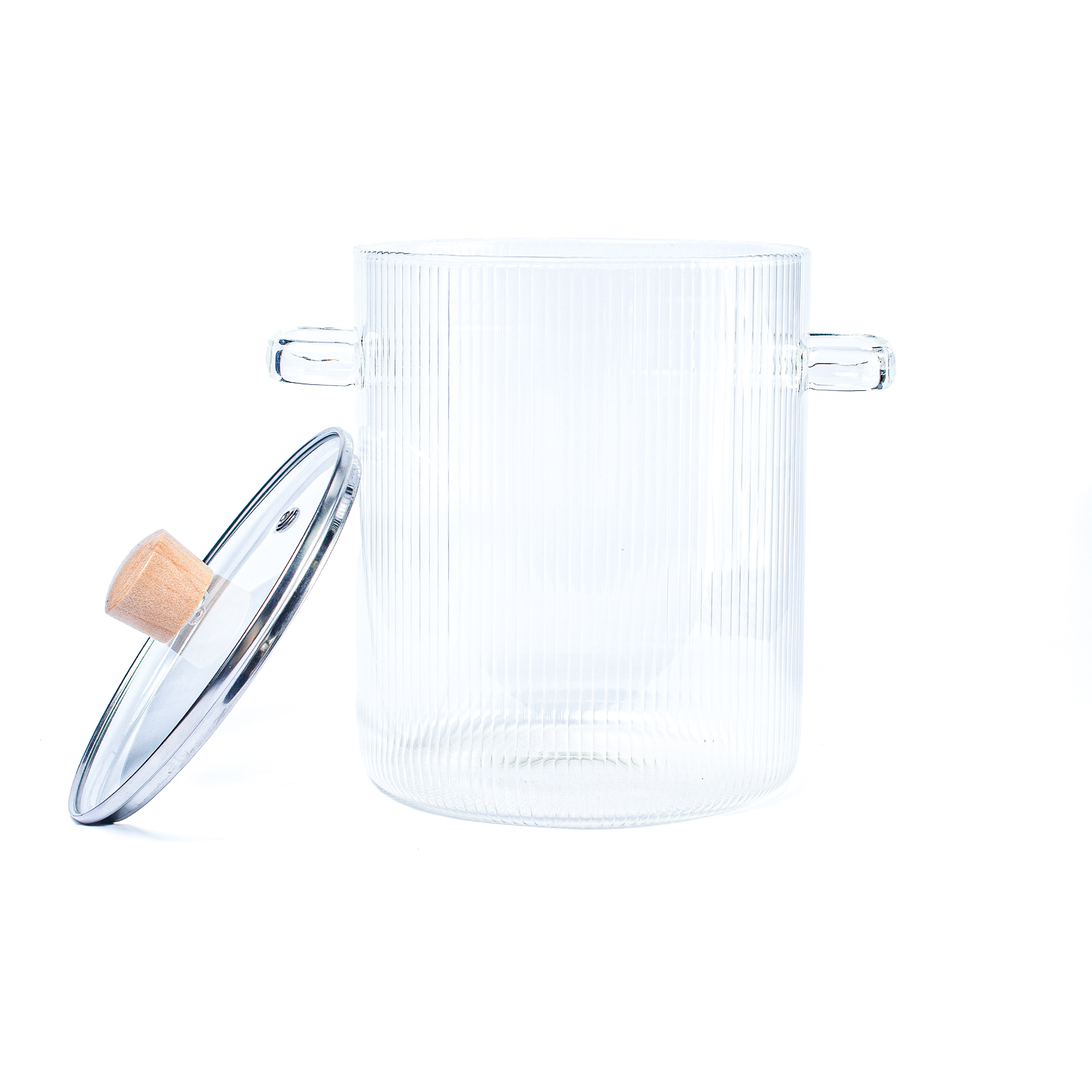 Está hecha en vidrio Borsilcato de alta calidad, mango en vidrio y tapa mango madera