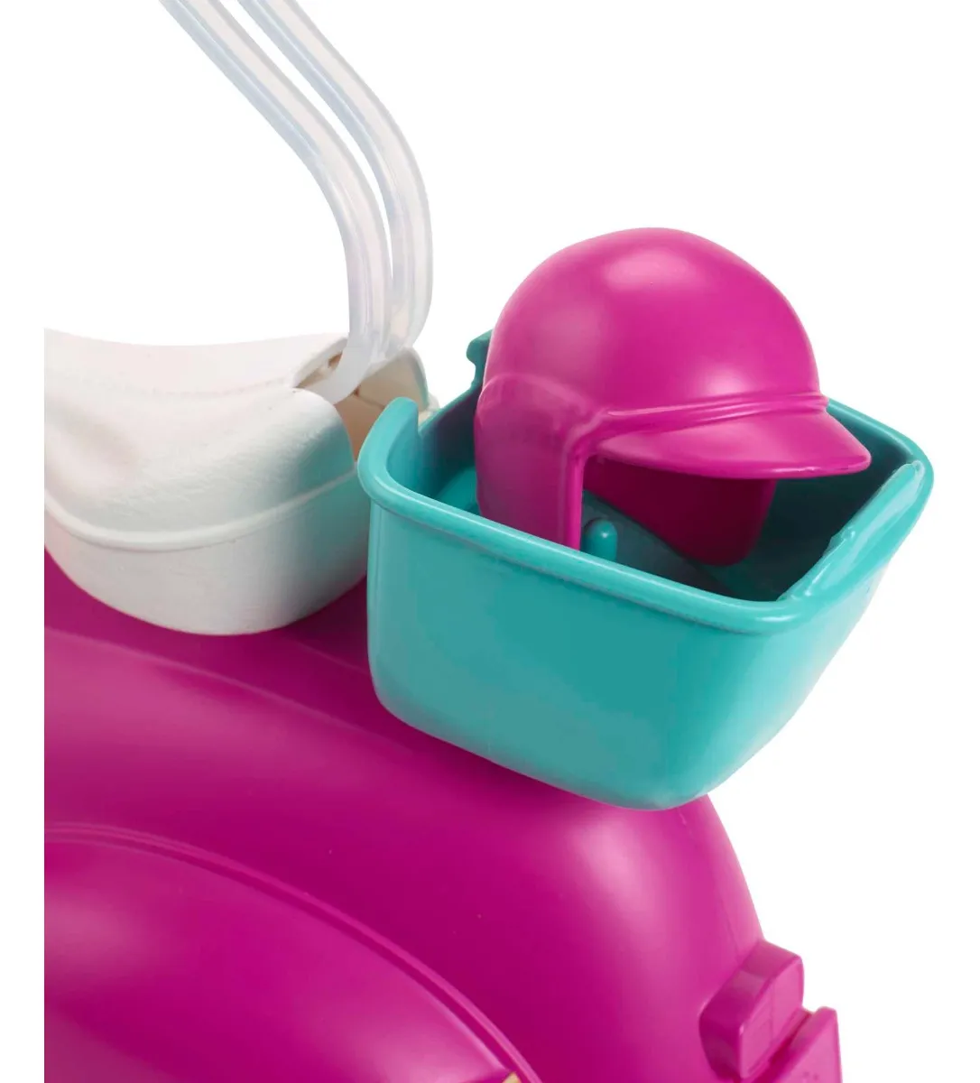 El scooter ruedas funcionales, se detiene con un pie de apoyo, tiene clips en el manillar que sostienen las manos de la muñeca Barbie en su lugar y una canasta azul en la parte posterior para el cachorro. Los accesorios incluyen una mochila, cámara y un tazón para perros.